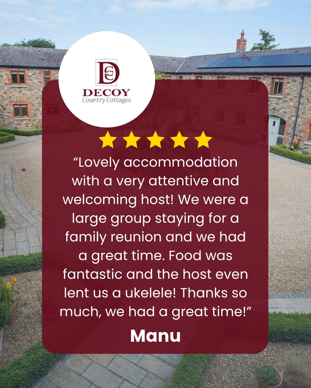 Decoy Country Cottages offers a peaceful countryside escape in the heart of the Boyne Valley, Co Meath, just a short drive from Dublin. Tucked away along a charming tree lined avenue, this collection of beautifully restored holiday homes invites guests to relax, unwind and reconnect with nature in one of Ireland’s most historic regions. Set around a landscaped courtyard, the eight luxury self catering cottages combine rustic charm with modern comfort. Each cottage is thoughtfully designed with spacious interiors, cosy living areas and scenic views of the surrounding countryside. With options ranging from romantic retreats for two to larger cottages perfect for family gatherings or group holidays, Decoy Country Cottages offers something for every type of getaway. Many cottages are also pet friendly, so your four legged companion can join the adventure. Guests can enjoy a relaxed countryside atmosphere while still being close to the rich heritage and attractions of the Boyne Valley, including ancient monuments, historic estates and scenic walking routes. The peaceful setting makes it ideal for families, couples and groups looking to slow down and enjoy Ireland’s countryside. Whether you are planning a family holiday near Dublin, a special celebration with friends or a romantic escape in Ireland’s Ancient East, Decoy Country Cottages offers comfort, space and a warm countryside welcome.