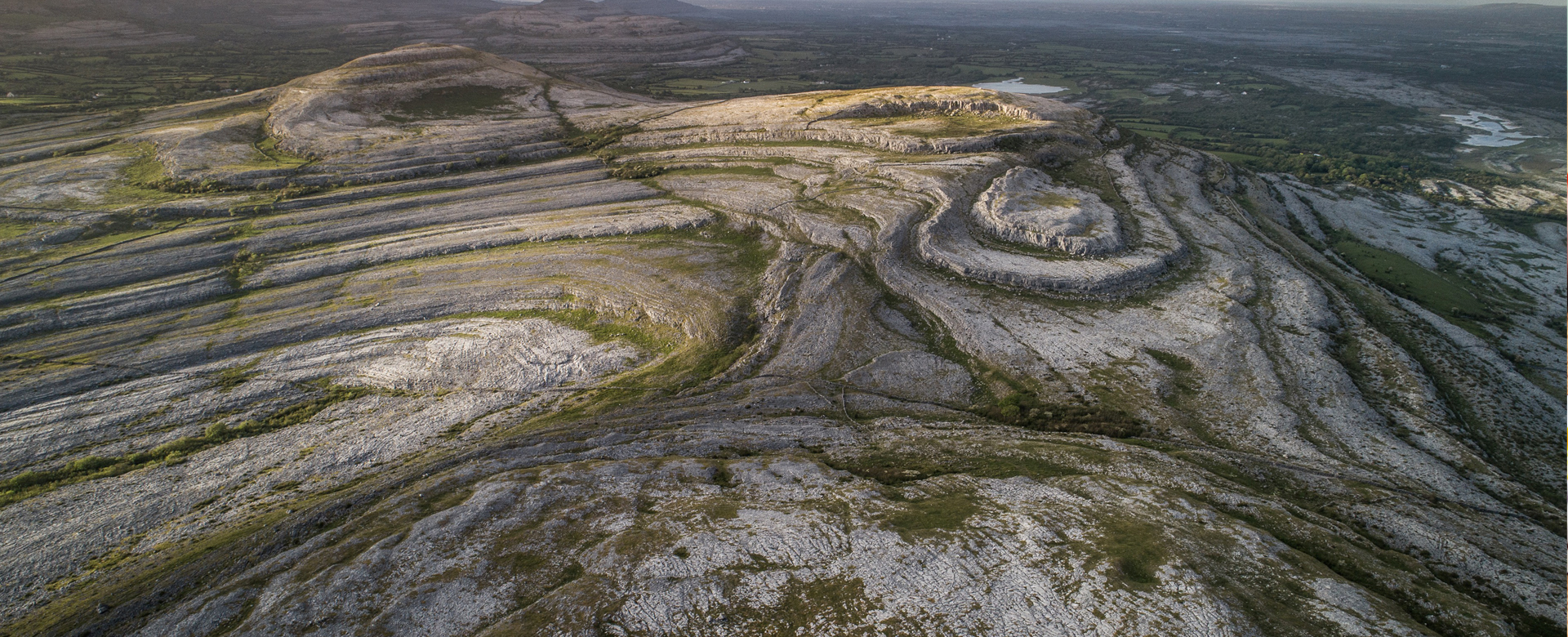 The word “Burren” comes from the Irish word “Boireann” meaning “rocky place”. Covering an area of approximately 360sq kilometres, The Burren stretches from north county Clare to east Galway. It is a place where the wild Atlantic Ocean meets Europe, its fierceness matched by the Burren’s richness and its fertile rock. The landscape of the Burren has been shaped by geological forces for hundreds of millions of years. The rocks that form the landscape were all formed during the Carboniferous period between 359 and 299 million years ago.